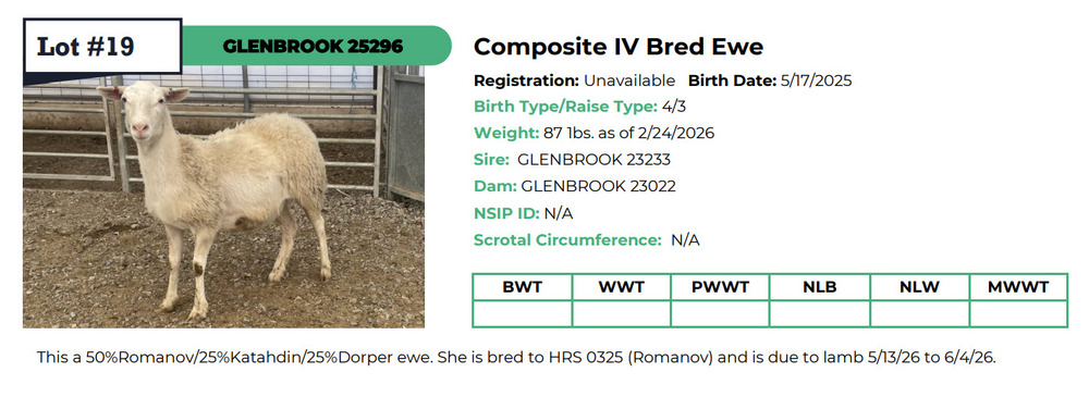 DESCIPTION: This a 50% Romanov/25% Katahdin/25% Dorper ewe. She is bred to HRS 0325 (Romanov) and is due to lamb 5/13/26 to 6/4/26.