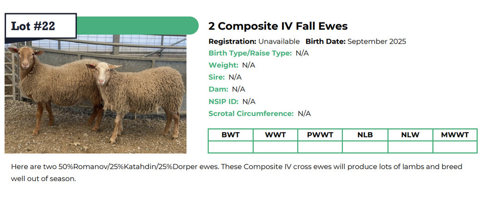 DESCIPTION: Here are two 50% Romanov/25% Katahdin/ 25% Dorper ewes. These Composite IV cross ewes will produce lots of lambs and breed well out of season.