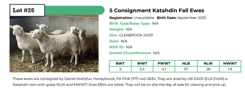 DESCIPTION: These ewes are consigned by Daniel Stoltzfus, Honeybrook, PA PH# (717) 442-5634. They are sired by GB 24031 (ELR 21400) a Katahdin ram with great NLW and MWWT! Sires EBVs are listed. They will be on site the day of sale for viewing and pick up.