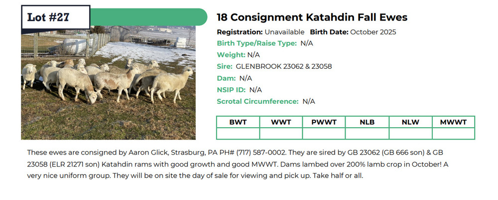 DESCIPTION: These ewes are consigned by Aaron Glick, Strasburg, PA PH# (717) 587-0002. They are sired by GB 23062 (GB 666 son) & GB 23058 (ELR 21271 son) Katahdin rams with good growth and good MWWT. Dams lambed over 200% lamb crop in October! A very nice uniform group. They will be on site the day of sale for viewing and pick up. Take half or all.