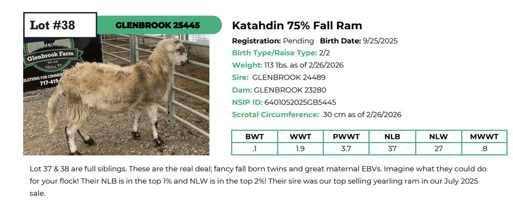 DESCIPTION: Lot 37 & 38 are full siblings. These are the real deal; fancy fall born twins and great maternal EBVs. Imagine what they could do for your flock! Their NLB is in the top 1% and NLW is in the top 2%! Their sire was our top selling yearling ram in our July 2025 sale.