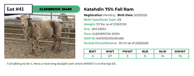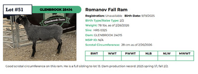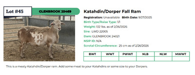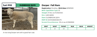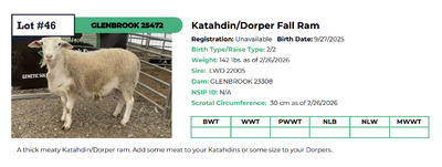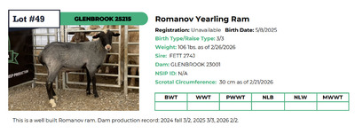 Glenbrook Farm SHEEP AUCTION 114 Glenbrook Rd, Leola PA, 17540 130 Hd. Katahdin, Dorper, Romanov Sheep Contact Agent: Myles Branch 336-583-5725 Catalog | Terms of Auction Download CATALOG Catalog | Terms Download CATALOG All Items (55) No Category (55) Categories All Items (55) No Category (55) Search Item #: Keyword: Search Catalog Item #: Keyword: 20 items per page 50 items per page 100 items per page Go to page #: 1 , 2 , 3 #41 – Katahdin 75% SEX: Ram CLASS: Fall EAR TAG: GLENBROOK 25480 WEIGHT: 121 SIRE: ZIM 23054 DAM: GLENBROOK 20334 DESCIPTION: Full sibling to lot 4. He is a nice long straight ram who's MWWT is in the top 5%. DOB: 09/29/25 Location: 114 Glenbrook Rd, Leola PA, 17540 Contact Agent: Myles Branch 336-583-5725 More Info / Bid Now Track this Item Sold High Bid: $950.00 – #1015 #41 – Katahdin 75% Sold High Bid: $950 More Details More Info / Bid Track Item SEX: Ram CLASS: Fall EAR TAG: GLENBROOK 25480 WEIGHT: 121 SIRE: ZIM 23054 DAM: GLENBROOK 20334 DESCIPTION: Full sibling to lot 4. He is a nice long straight ram who's MWWT is in the top 5%. DOB: 09/29/25 Location: 114 Glenbrook Rd, Leola PA, 17540 Contact Agent: Myles Branch 336-583-5725 #42 – Commercial Katahdin SEX: Ram CLASS: Fall EAR TAG: GLENBROOK 25494 WEIGHT: 124 SIRE: ZIM 23054 DAM: GLENBROOK 24334 DESCIPTION: A nice meaty commercial Katahdin ram with a wide front end on him. DOB: 10/09/25 Location: 114 Glenbrook Rd, Leola PA, 17540 Contact Agent: Myles Branch 336-583-5725 More Info / Bid Now Track this Item Sold High Bid: $925.00 – #143 #42 – Commercial Katahdin Sold High Bid: $925 More Details More Info / Bid Track Item SEX: Ram CLASS: Fall EAR TAG: GLENBROOK 25494 WEIGHT: 124 SIRE: ZIM 23054 DAM: GLENBROOK 24334 DESCIPTION: A nice meaty commercial Katahdin ram with a wide front end on him. DOB: 10/09/25 Location: 114 Glenbrook Rd, Leola PA, 17540 Contact Agent: Myles Branch 336-583-5725 #43 – Dorper SEX: Ram CLASS: Yearling EAR TAG: GLENBROOK 25375 WEIGHT: 136 SIRE: LWD 22005 DAM: GLENBROOK 23044 DESCIPTION: A medium framed thick Dorper ram with a good front end on him. DOB: 05/22/25 Location: 114 Glenbrook Rd, Leola PA, 17540 Contact Agent: Myles Branch 336-583-5725 More Info / Bid Now Track this Item Sold High Bid: $650.00 – #126 #43 – Dorper Sold High Bid: $650 More Details More Info / Bid Track Item SEX: Ram CLASS: Yearling EAR TAG: GLENBROOK 25375 WEIGHT: 136 SIRE: LWD 22005 DAM: GLENBROOK 23044 DESCIPTION: A medium framed thick Dorper ram with a good front end on him. DOB: 05/22/25 Location: 114 Glenbrook Rd, Leola PA, 17540 Contact Agent: Myles Branch 336-583-5725 #44 – Dorper SEX: Ram CLASS: Fall EAR TAG: GLENBROOK 25475 WEIGHT: 111 SIRE: LWD 22005 DAM: GLENBROOK 22014 DESCIPTION: A nice long Dorper ram with a good hair coat. DOB: 09/29/25 Location: 114 Glenbrook Rd, Leola PA, 17540 Contact Agent: Myles Branch 336-583-5725 More Info / Bid Now Track this Item Sold High Bid: $800.00 – #78 #44 – Dorper Sold High Bid: $800 More Details More Info / Bid Track Item SEX: Ram CLASS: Fall EAR TAG: GLENBROOK 25475 WEIGHT: 111 SIRE: LWD 22005 DAM: GLENBROOK 22014 DESCIPTION: A nice long Dorper ram with a good hair coat. DOB: 09/29/25 Location: 114 Glenbrook Rd, Leola PA, 17540 Contact Agent: Myles Branch 336-583-5725 #45 – Katahdin/Dorper SEX: Ram CLASS: Fall EAR TAG: GLENBROOK 25469 WEIGHT: 132 SIRE: LWD 22005 DAM: GLENBROOK 24021 DESCIPTION: This is a meaty Katahdin/Dorper ram. Add some meat to your Katahdins or some size to your Dorpers. DOB: 09/27/25 Location: 114 Glenbrook Rd, Leola PA, 17540 Contact Agent: Myles Branch 336-583-5725 More Info / Bid Now Track this Item Sold High Bid: $600.00 – #134 #45 – Katahdin/Dorper Sold High Bid: $600 More Details More Info / Bid Track Item SEX: Ram CLASS: Fall EAR TAG: GLENBROOK 25469 WEIGHT: 132 SIRE: LWD 22005 DAM: GLENBROOK 24021 DESCIPTION: This is a meaty Katahdin/Dorper ram. Add some meat to your Katahdins or some size to your Dorpers. DOB: 09/27/25 Location: 114 Glenbrook Rd, Leola PA, 17540 Contact Agent: Myles Branch 336-583-5725 #46 – Katahdin/Dorper SEX: Ram CLASS: Fall EAR TAG: GLENBROOK 25472 WEIGHT: 142 SIRE: LWD 22005 DAM: GLENBROOK 23308 DESCIPTION: A thick meaty Katahdin/Dorper ram. Add some meat to your Katahdins or some size to your Dorpers. DOB: 09/27/25 Location: 114 Glenbrook Rd, Leola PA, 17540 Contact Agent: Myles Branch 336-583-5725 More Info / Bid Now Track this Item Sold High Bid: $600.00 – #148 #46 – Katahdin/Dorper Sold High Bid: $600 More Details More Info / Bid Track Item SEX: Ram CLASS: Fall EAR TAG: GLENBROOK 25472 WEIGHT: 142 SIRE: LWD 22005 DAM: GLENBROOK 23308 DESCIPTION: A thick meaty Katahdin/Dorper ram. Add some meat to your Katahdins or some size to your Dorpers. DOB: 09/27/25 Location: 114 Glenbrook Rd, Leola PA, 17540 Contact Agent: Myles Branch 336-583-5725 #47 – Composite IV SEX: Ram CLASS: Fall EAR TAG: GLENBROOK 25430 WEIGHT: 115 SIRE: GLENBROOK 23233 DAM: GLENBROOK 22072 DESCIPTION: This is a 50% Romanov/25% Katahdin/ 25% Dorper ram. Like the idea of adding some Romanov genetics but don't want to go with too much Romanov? Use one of these Composite IV rams to add 25% Romanov to your ewe flock. DOB: 09/23/25 Location: 114 Glenbrook Rd, Leola PA, 17540 Contact Agent: Myles Branch 336-583-5725 More Info / Bid Now Track this Item Sold High Bid: $625.00 – #122 #47 – Composite IV Sold High Bid: $625 More Details More Info / Bid Track Item SEX: Ram CLASS: Fall EAR TAG: GLENBROOK 25430 WEIGHT: 115 SIRE: GLENBROOK 23233 DAM: GLENBROOK 22072 DESCIPTION: This is a 50% Romanov/25% Katahdin/ 25% Dorper ram. Like the idea of adding some Romanov genetics but don't want to go with too much Romanov? Use one of these Composite IV rams to add 25% Romanov to your ewe flock. DOB: 09/23/25 Location: 114 Glenbrook Rd, Leola PA, 17540 Contact Agent: Myles Branch 336-583-5725 #48 – Composite IV SEX: Ram CLASS: Fall EAR TAG: GLENBROOK 25482 WEIGHT: 95 SIRE: DAM: GLENBROOK 24214 DESCIPTION: This is a 50% Ro