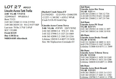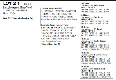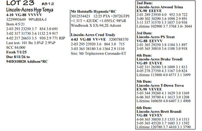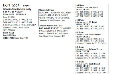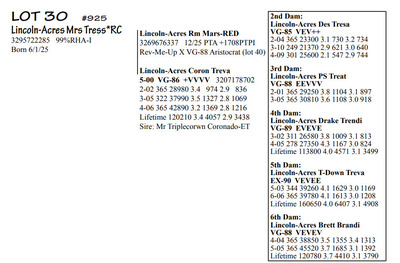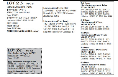 Lincoln Acres Dispersal 9411 Lucey Lane, Lancaster WI, 53813 Elite Holstein offering Contact Agent: Aaron Ray 336-363-4639 Catalog | Terms of Auction Download CATALOG Download UPDATES Download LOT 33 UPDATED Download LOT 106 Download SALE ORDER ISSUU CATALOG LINK Catalog | Terms Download CATALOG Download UPDATES Download LOT 33 UPDATED Download LOT 106 Download SALE ORDER ISSUU CATALOG LINK All Items (112) Cattle (112) Categories All Items (112) Cattle (112) Search Item #: Keyword: Search Catalog Item #: Keyword: 20 items per page 50 items per page 100 items per page Go to page #: 1 , 2 , 3 , 4 , 5 , 6 #20 – Lincoln-Acres Crush Tracy 5-05 VG-88 VVEVV 3216626574 99%RHA-I Born 9/10/20 2-04 291 22940 3.9 905 3.1 716 3-04 365 28910 3.6 1042 3.2 933 4-07 276 27380 3.5 958 3.3 876 RIP Last test- 78 lbs 3.4%F 3.5%P SCC 725,000 Fresh 5/3/25 Due 9/22/26 to 94HO19826 Showtime*RC Location: 9411 Lucey Lane, Lancaster WI, 53813 Contact Agent: Aaron Ray 336-363-4639 More Info / Bid Now Track this Item Sold High Bid: $2,400.00 – #500 #20 – Lincoln-Acres Crush Tracy Sold High Bid: $2,400 More Details More Info / Bid Track Item 5-05 VG-88 VVEVV 3216626574 99%RHA-I Born 9/10/20 2-04 291 22940 3.9 905 3.1 716 3-04 365 28910 3.6 1042 3.2 933 4-07 276 27380 3.5 958 3.3 876 RIP Last test- 78 lbs 3.4%F 3.5%P SCC 725,000 Fresh 5/3/25 Due 9/22/26 to 94HO19826 Showtime*RC Location: 9411 Lucey Lane, Lancaster WI, 53813 Contact Agent: Aaron Ray 336-363-4639 #21 – Lincoln-Acres Show Terri 3281437791 99%RHA-I Born 1/12/24 Due 2/11/26 to Vincint (Lot 76) Location: 9411 Lucey Lane, Lancaster WI, 53813 Contact Agent: Aaron Ray 336-363-4639 More Info / Bid Now Track this Item Sold High Bid: $3,050.00 – #500 #21 – Lincoln-Acres Show Terri Sold High Bid: $3,050 More Details More Info / Bid Track Item 3281437791 99%RHA-I Born 1/12/24 Due 2/11/26 to Vincint (Lot 76) Location: 9411 Lucey Lane, Lancaster WI, 53813 Contact Agent: Aaron Ray 336-363-4639 #22 – Lincoln-Acres Allg Tilly 3295722276 99%RHA-I Born 3/26/25 Location: 9411 Lucey Lane, Lancaster WI, 53813 Contact Agent: Aaron Ray 336-363-4639 More Info / Bid Now Track this Item Sold High Bid: $2,050.00 – #500 #22 – Lincoln-Acres Allg Tilly Sold High Bid: $2,050 More Details More Info / Bid Track Item 3295722276 99%RHA-I Born 3/26/25 Location: 9411 Lucey Lane, Lancaster WI, 53813 Contact Agent: Aaron Ray 336-363-4639 #23 – Lincoln-Acres Hyp Tonya 4-10 VG-88 VVVVV 3229993649 99%RHA-I Born 4/5/21 2-03 293 23250 3.7 854 3.0 691 3-02 317 31730 3.6 1132 2.9 917 4-02 217 26653 3.5 930 2.9 771 RIP Last test- 101 lbs 3.8%F 2.9%P SCC 84,000 Fresh 7/1/25 Due 8/11/26 to 94HO18820 Addison*RC Location: 9411 Lucey Lane, Lancaster WI, 53813 Contact Agent: Aaron Ray 336-363-4639 More Info / Bid Now Track this Item Sold High Bid: $3,000.00 – #500 #23 – Lincoln-Acres Hyp Tonya Sold High Bid: $3,000 More Details More Info / Bid Track Item 4-10 VG-88 VVVVV 3229993649 99%RHA-I Born 4/5/21 2-03 293 23250 3.7 854 3.0 691 3-02 317 31730 3.6 1132 2.9 917 4-02 217 26653 3.5 930 2.9 771 RIP Last test- 101 lbs 3.8%F 2.9%P SCC 84,000 Fresh 7/1/25 Due 8/11/26 to 94HO18820 Addison*RC Location: 9411 Lucey Lane, Lancaster WI, 53813 Contact Agent: Aaron Ray 336-363-4639 #24 – Lincoln-Acres Add Topaz 3281437802 99%RHA-I Born 6/21/24 Bred 2/16/16 to Vincent (Lot 76) Location: 9411 Lucey Lane, Lancaster WI, 53813 Contact Agent: Aaron Ray 336-363-4639 More Info / Bid Now Track this Item Sold High Bid: $2,000.00 – #500 #24 – Lincoln-Acres Add Topaz Sold High Bid: $2,000 More Details More Info / Bid Track Item 3281437802 99%RHA-I Born 6/21/24 Bred 2/16/16 to Vincent (Lot 76) Location: 9411 Lucey Lane, Lancaster WI, 53813 Contact Agent: Aaron Ray 336-363-4639 #25 – Lincoln-Acres Fe Trust 2-05 VG-85 VVV+V 3281437783 99%RHA-I Born 9/20/23 2-02 60 4494 3.4 156 2.8 124 RIP Last test- 85 lbs 3.1%F 2.8%P SCC 33,000 Fresh 12/5/25 Bred 2/26/26 to 788HO001 Cut Right-RED (sexed) Location: 9411 Lucey Lane, Lancaster WI, 53813 Contact Agent: Aaron Ray 336-363-4639 More Info / Bid Now Track this Item Sold High Bid: $3,600.00 – #500 #25 – Lincoln-Acres Fe Trust Sold High Bid: $3,600 More Details More Info / Bid Track Item 2-05 VG-85 VVV+V 3281437783 99%RHA-I Born 9/20/23 2-02 60 4494 3.4 156 2.8 124 RIP Last test- 85 lbs 3.1%F 2.8%P SCC 33,000 Fresh 12/5/25 Bred 2/26/26 to 788HO001 Cut Right-RED (sexed) Location: 9411 Lucey Lane, Lancaster WI, 53813 Contact Agent: Aaron Ray 336-363-4639 #26 – Lincoln-Acres Twyla RC*RC 3313090150 99%RHA-I Born 12/5/25 Location: 9411 Lucey Lane, Lancaster WI, 53813 Contact Agent: Aaron Ray 336-363-4639 More Info / Bid Now Track this Item Sold High Bid: $1,350.00 – #500 #26 – Lincoln-Acres Twyla RC*RC Sold High Bid: $1,350 More Details More Info / Bid Track Item 3313090150 99%RHA-I Born 12/5/25 Location: 9411 Lucey Lane, Lancaster WI, 53813 Contact Agent: Aaron Ray 336-363-4639 #27 – Lincoln-Acres Tatt Trella 4-00 VG-88 VVEVE 3229993657 99%RHA-I Born 7/5/21 2-05 365 33360 3.3 1116 2.9 954 3-09 300 30359 3.0 914 2.9 877 RIP Last test- 78 lbs 3.7%F 3.0%P SCC 135,000 Fresh 8/3/25 Due 1/30/26 to 94HO14105 Aftershock Location: 9411 Lucey Lane, Lancaster WI, 53813 Contact Agent: Aaron Ray 336-363-4639 More Info / Bid Now Track this Item Sold High Bid: $2,350.00 – #500 #27 – Lincoln-Acres Tatt Trella Sold High Bid: $2,350 More Details More Info / Bid Track Item 4-00 VG-88 VVEVE 3229993657 99%RHA-I Born 7/5/21 2-05 365 33360 3.3 1116 2.9 954 3-09 300 30359 3.0 914 2.9 877 RIP Last test- 78 lbs 3.7%F 3.0%P SCC 135,000 Fresh 8/3/25 Due 1/30/26 to 94HO14105 Aftershock Location: 9411 Lucey Lane, Lancaster WI, 53813 Contact Agent: Aaron Ray 336-363-4639 #28 – Lincoln-Acres Gone Tea-RED 3281437789 99%RHA-I Born 12/8/23 Due 4/18/26 to 94HO942 Unreal-RED Location: 9411 Lucey Lane, Lancaster WI, 53813 Contact Agent: Aaron Ray 336-363-4639 More Info / Bid Now Track this Item Sold High Bid: $4,350.00 – #500 #28 – Lincoln-Acres Gone Tea-RED Sold High Bid: $4,350 