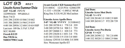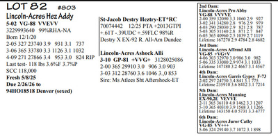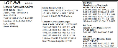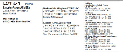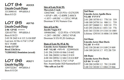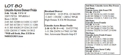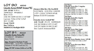 Lincoln Acres Dispersal 9411 Lucey Lane, Lancaster WI, 53813 Elite Holstein offering Contact Agent: Aaron Ray 336-363-4639 Catalog | Terms of Auction Download CATALOG Download UPDATES Download LOT 33 UPDATED Download LOT 106 Download SALE ORDER ISSUU CATALOG LINK Catalog | Terms Download CATALOG Download UPDATES Download LOT 33 UPDATED Download LOT 106 Download SALE ORDER ISSUU CATALOG LINK All Items (112) Cattle (112) Categories All Items (112) Cattle (112) Search Item #: Keyword: Search Catalog Item #: Keyword: 20 items per page 50 items per page 100 items per page Go to page #: 1 , 2 , 3 , 4 , 5 , 6 #80 – Lincoln-Acres Denver Frida 5-06 VG-86 VVV+V 3207178724 99%RHA-I Born 1/20/20 2-03 365 32380 4.4 1438 3.2 1027 3-07 365 41720 3.7 1553 3.1 1286 4-11 305 41630 2.9 1216 2.8 1147 LTD 126310 3.7 4696 3.0 3812 *Will sell fresh, Due 3/3/26 to 94HO21303 Lizzo Location: 9411 Lucey Lane, Lancaster WI, 53813 Contact Agent: Aaron Ray 336-363-4639 More Info / Bid Now Track this Item Sold High Bid: $2,850.00 – #1037 #80 – Lincoln-Acres Denver Frida Sold High Bid: $2,850 More Details More Info / Bid Track Item 5-06 VG-86 VVV+V 3207178724 99%RHA-I Born 1/20/20 2-03 365 32380 4.4 1438 3.2 1027 3-07 365 41720 3.7 1553 3.1 1286 4-11 305 41630 2.9 1216 2.8 1147 LTD 126310 3.7 4696 3.0 3812 *Will sell fresh, Due 3/3/26 to 94HO21303 Lizzo Location: 9411 Lucey Lane, Lancaster WI, 53813 Contact Agent: Aaron Ray 336-363-4639 #81 – Lincoln-Acres Alle Ella 3269676344 99%RHA-I Born 7/23/23 Due 4/18/26 to 94HO19826 Showtime*RC Location: 9411 Lucey Lane, Lancaster WI, 53813 Contact Agent: Aaron Ray 336-363-4639 More Info / Bid Now Track this Item Sold High Bid: $3,800.00 – #500 #81 – Lincoln-Acres Alle Ella Sold High Bid: $3,800 More Details More Info / Bid Track Item 3269676344 99%RHA-I Born 7/23/23 Due 4/18/26 to 94HO19826 Showtime*RC Location: 9411 Lucey Lane, Lancaster WI, 53813 Contact Agent: Aaron Ray 336-363-4639 #82 – Lincoln-Acres Hez Addy 5-02 VG-88 VVEVV 3229993640 99%RHA-NA Born 12/1/20 2-05 327 23740 3.9 931 3.1 737 3-06 365 33780 3.3 1126 3.1 1032 4-09 271 27866 3.4 953 3.0 824 RIP Last test- 118 lbs 3.6%F 3.7%P SCC 118,000 Fresh 5/8/25 Due 2/26/26 to 94HO18518 Denver (sexed) Location: 9411 Lucey Lane, Lancaster WI, 53813 Contact Agent: Aaron Ray 336-363-4639 More Info / Bid Now Track this Item Sold High Bid: $2,600.00 – #500 #82 – Lincoln-Acres Hez Addy Sold High Bid: $2,600 More Details More Info / Bid Track Item 5-02 VG-88 VVEVV 3229993640 99%RHA-NA Born 12/1/20 2-05 327 23740 3.9 931 3.1 737 3-06 365 33780 3.3 1126 3.1 1032 4-09 271 27866 3.4 953 3.0 824 RIP Last test- 118 lbs 3.6%F 3.7%P SCC 118,000 Fresh 5/8/25 Due 2/26/26 to 94HO18518 Denver (sexed) Location: 9411 Lucey Lane, Lancaster WI, 53813 Contact Agent: Aaron Ray 336-363-4639 #83 – Lincoln-Acres Crush Adelia 3281437799 99%RHA-I Born 6/7/24 Location: 9411 Lucey Lane, Lancaster WI, 53813 Contact Agent: Aaron Ray 336-363-4639 More Info / Bid Now Track this Item Sold High Bid: $2,000.00 – #500 #83 – Lincoln-Acres Crush Adelia Sold High Bid: $2,000 More Details More Info / Bid Track Item 3281437799 99%RHA-I Born 6/7/24 Location: 9411 Lucey Lane, Lancaster WI, 53813 Contact Agent: Aaron Ray 336-363-4639 #84 – Lincoln-Acres Crush Amelia 3313090149 99%RHA-I Born 10/30/25 Location: 9411 Lucey Lane, Lancaster WI, 53813 Contact Agent: Aaron Ray 336-363-4639 More Info / Bid Now Track this Item Sold High Bid: $950.00 – #500 #84 – Lincoln-Acres Crush Amelia Sold High Bid: $950 More Details More Info / Bid Track Item 3313090149 99%RHA-I Born 10/30/25 Location: 9411 Lucey Lane, Lancaster WI, 53813 Contact Agent: Aaron Ray 336-363-4639 #85 – Lincoln-Acres Unix Ava 3-02 GP-84 V++++ 3269676324 99%RHA-I Born 12/19/22 2-04 286 26554 3.4 891 3.1 802 RIP Last test 93 lbs 3.8%F 3.2%P SCC 46,000 Fresh 4/23/25 Due 7/4/26 to 94HO18540 Coronado Location: 9411 Lucey Lane, Lancaster WI, 53813 Contact Agent: Aaron Ray 336-363-4639 More Info / Bid Now Track this Item Sold High Bid: $2,850.00 – #500 #85 – Lincoln-Acres Unix Ava Sold High Bid: $2,850 More Details More Info / Bid Track Item 3-02 GP-84 V++++ 3269676324 99%RHA-I Born 12/19/22 2-04 286 26554 3.4 891 3.1 802 RIP Last test 93 lbs 3.8%F 3.2%P SCC 46,000 Fresh 4/23/25 Due 7/4/26 to 94HO18540 Coronado Location: 9411 Lucey Lane, Lancaster WI, 53813 Contact Agent: Aaron Ray 336-363-4639 #86 – Lincoln-Acres On Avery 3295722281 99%RHA-I Born 4/23/25 Location: 9411 Lucey Lane, Lancaster WI, 53813 Contact Agent: Aaron Ray 336-363-4639 More Info / Bid Now Track this Item Sold High Bid: $1,400.00 – #500 #86 – Lincoln-Acres On Avery Sold High Bid: $1,400 More Details More Info / Bid Track Item 3295722281 99%RHA-I Born 4/23/25 Location: 9411 Lucey Lane, Lancaster WI, 53813 Contact Agent: Aaron Ray 336-363-4639 #87 – Lincoln-Acres Denver Anjil 3-02 VG-86 ++V+V 3269676322 99%RHA-I Born 12/11/22 1-11 351 28000 3.5 970 3.0 839 Fresh 1/21/26 1st test- 101 lbs 3.9%F 3.8%P SCC 21,000 Location: 9411 Lucey Lane, Lancaster WI, 53813 Contact Agent: Aaron Ray 336-363-4639 More Info / Bid Now Track this Item Sold High Bid: $3,900.00 – #500 #87 – Lincoln-Acres Denver Anjil Sold High Bid: $3,900 More Details More Info / Bid Track Item 3-02 VG-86 ++V+V 3269676322 99%RHA-I Born 12/11/22 1-11 351 28000 3.5 970 3.0 839 Fresh 1/21/26 1st test- 101 lbs 3.9%F 3.8%P SCC 21,000 Location: 9411 Lucey Lane, Lancaster WI, 53813 Contact Agent: Aaron Ray 336-363-4639 #87A – HEIFER CALF *Reg. pending - Born 1/21/26 Location: 9411 Lucey Lane, Lancaster WI, 53813 Contact Agent: Aaron Ray 336-363-4639 More Info / Bid Now Track this Item Sold High Bid: $1,100.00 – #500 #87A – HEIFER CALF Sold High Bid: $1,100 More Details More Info / Bid Track Item *Reg. pending - Born 1/21/26 Location: 9411 Lucey Lane, Lancaster WI, 53813 Contact Agent: Aaron Ray 336-363-4639 #88 – Lincoln-Acres Art Andrea 2-02 GP-82 +GG+ 3281437788 99%RHA-I Born 12/2/23 2-00 35 1881 4.3 94 3.4 66 RIP Last test- 66 lbs 4.5%F 3.2%P 