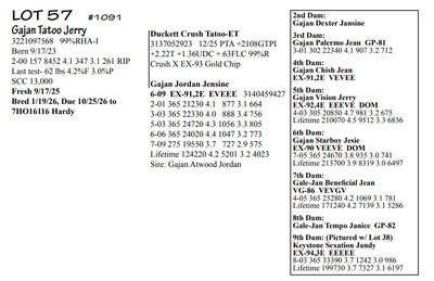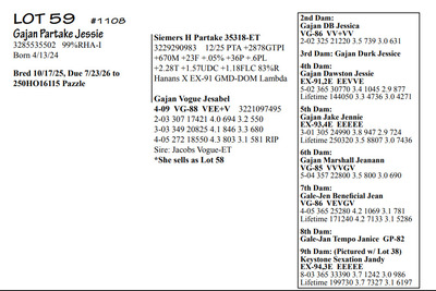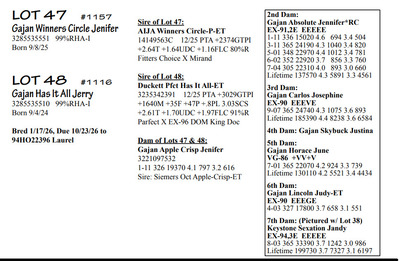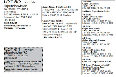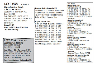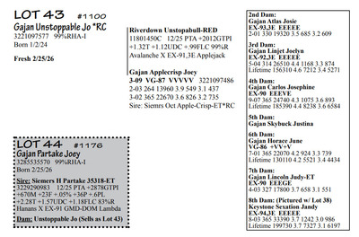 GAJAN HOLSTEINS DISPERSAL 1917 N. Churchtown RD, East Earl PA, 17519 Dairy Dispersal Auction Contact Agent: Katie 717-543-7883 Catalog | Terms of Auction Download CATALOG Download SALE ORDER Download UPDATES ISSUU CATALOG LINK Catalog | Terms Download CATALOG Download SALE ORDER Download UPDATES ISSUU CATALOG LINK All Items (130) Cattle (130) Categories All Items (130) Cattle (130) Search Item #: Keyword: Search Catalog Item #: Keyword: 20 items per page 50 items per page 100 items per page Go to page #: 1 , 2 , 3 , 4 , 5 , 6 #41 – Gajan DB Josephine 3285535500 99%RHA-I Born 2/25/24 Bred 8/29/25, Due 6/4/26 to 7HO17162 Haliant-P Location: 1917 N. Churchtown RD, East Earl PA, 17519 Contact Agent: Katie 717-543-7883 More Info / Bid Now Track this Item Sold High Bid: $3,800.00 – #32 #41 – Gajan DB Josephine Sold High Bid: $3,800 More Details More Info / Bid Track Item 3285535500 99%RHA-I Born 2/25/24 Bred 8/29/25, Due 6/4/26 to 7HO17162 Haliant-P Location: 1917 N. Churchtown RD, East Earl PA, 17519 Contact Agent: Katie 717-543-7883 #42 – Gajan Hasitall Joyous 3285535515 99%RHA-I Born 9/29/24 Bred 12/26/25, Due 10/1/26 to 94HO22396 Laurel Location: 1917 N. Churchtown RD, East Earl PA, 17519 Contact Agent: Katie 717-543-7883 More Info / Bid Now Track this Item Sold High Bid: $3,100.00 – #38 #42 – Gajan Hasitall Joyous Sold High Bid: $3,100 More Details More Info / Bid Track Item 3285535515 99%RHA-I Born 9/29/24 Bred 12/26/25, Due 10/1/26 to 94HO22396 Laurel Location: 1917 N. Churchtown RD, East Earl PA, 17519 Contact Agent: Katie 717-543-7883 #43 – Gajan Unstoppable Jo *RC 3221097577 99%RHA-I Born 1/2/24 Fresh 2/25/26 Location: 1917 N. Churchtown RD, East Earl PA, 17519 Contact Agent: Katie 717-543-7883 More Info / Bid Now Track this Item Sold High Bid: $3,800.00 – #116 #43 – Gajan Unstoppable Jo *RC Sold High Bid: $3,800 More Details More Info / Bid Track Item 3221097577 99%RHA-I Born 1/2/24 Fresh 2/25/26 Location: 1917 N. Churchtown RD, East Earl PA, 17519 Contact Agent: Katie 717-543-7883 #44 – Gajan Partake Joey 3285535570 99%RHA-I Born 2/25/26 Location: 1917 N. Churchtown RD, East Earl PA, 17519 Contact Agent: Katie 717-543-7883 More Info / Bid Now Track this Item Sold High Bid: $1,175.00 – #96 #44 – Gajan Partake Joey Sold High Bid: $1,175 More Details More Info / Bid Track Item 3285535570 99%RHA-I Born 2/25/26 Location: 1917 N. Churchtown RD, East Earl PA, 17519 Contact Agent: Katie 717-543-7883 #45 – Gajan Partake Jen 3285535532 99%RHA-I Born 2/3/25 Location: 1917 N. Churchtown RD, East Earl PA, 17519 Contact Agent: Katie 717-543-7883 More Info / Bid Now Track this Item Sold High Bid: $2,450.00 – #66 #45 – Gajan Partake Jen Sold High Bid: $2,450 More Details More Info / Bid Track Item 3285535532 99%RHA-I Born 2/3/25 Location: 1917 N. Churchtown RD, East Earl PA, 17519 Contact Agent: Katie 717-543-7883 #46 – Gajan DB Jenilyn 3221097573 99%RHA-I Born 10/7/23 2-01 97 6881 4.1 280 2.9 199 RIP Last test- 66 lbs 4.0%F 2.8%P SCC 13,000 Fresh 11/16/25 Location: 1917 N. Churchtown RD, East Earl PA, 17519 Contact Agent: Katie 717-543-7883 More Info / Bid Now Track this Item Sold High Bid: $3,800.00 – #123 #46 – Gajan DB Jenilyn Sold High Bid: $3,800 More Details More Info / Bid Track Item 3221097573 99%RHA-I Born 10/7/23 2-01 97 6881 4.1 280 2.9 199 RIP Last test- 66 lbs 4.0%F 2.8%P SCC 13,000 Fresh 11/16/25 Location: 1917 N. Churchtown RD, East Earl PA, 17519 Contact Agent: Katie 717-543-7883 #47 – Gajan Winners Circle Jenifer 3285535551 99%RHA-I Born 9/8/25 Location: 1917 N. Churchtown RD, East Earl PA, 17519 Contact Agent: Katie 717-543-7883 More Info / Bid Now Track this Item Sold High Bid: $2,000.00 – #161 #47 – Gajan Winners Circle Jenifer Sold High Bid: $2,000 More Details More Info / Bid Track Item 3285535551 99%RHA-I Born 9/8/25 Location: 1917 N. Churchtown RD, East Earl PA, 17519 Contact Agent: Katie 717-543-7883 #48 – Gajan Has It All Jerry 3285535510 99%RHA-I Born 9/4/24 Bred 1/17/26, Due 10/23/26 to 94HO22396 Laurel Location: 1917 N. Churchtown RD, East Earl PA, 17519 Contact Agent: Katie 717-543-7883 More Info / Bid Now Track this Item Sold High Bid: $3,300.00 – #1022 #48 – Gajan Has It All Jerry Sold High Bid: $3,300 More Details More Info / Bid Track Item 3285535510 99%RHA-I Born 9/4/24 Bred 1/17/26, Due 10/23/26 to 94HO22396 Laurel Location: 1917 N. Churchtown RD, East Earl PA, 17519 Contact Agent: Katie 717-543-7883 #49 – Gajan Master Jean 3285535496 99%RHA-I Born 1/18/24 Fresh 2/3/26 Location: 1917 N. Churchtown RD, East Earl PA, 17519 Contact Agent: Katie 717-543-7883 More Info / Bid Now Track this Item Sold High Bid: $3,400.00 – #48 #49 – Gajan Master Jean Sold High Bid: $3,400 More Details More Info / Bid Track Item 3285535496 99%RHA-I Born 1/18/24 Fresh 2/3/26 Location: 1917 N. Churchtown RD, East Earl PA, 17519 Contact Agent: Katie 717-543-7883 #50 – Gajan Ike June 6-00 EX-90 EVVVE 3140459447 100%RHA-NA Born 12/5/17 2-01 333 19,926 3.7 744 3.1 614 3-01 365 24666 3.9 952 3.0 746 4-05 365 26509 3.8 995 3.0 803 6-02 343 25826 3.7 944 3.0 780 7-02 303 21378 3.9 827 2.9 620 LTD 133135 3.9 5127 3.1 4111 Fresh 3/3/26 Location: 1917 N. Churchtown RD, East Earl PA, 17519 Contact Agent: Katie 717-543-7883 More Info / Bid Now Track this Item No Bids Starting at $1,500.00 Login to Bid #50 – Gajan Ike June Starting at $1,500.00 Login to Bid More Details More Info / Bid Track Item 6-00 EX-90 EVVVE 3140459447 100%RHA-NA Born 12/5/17 2-01 333 19,926 3.7 744 3.1 614 3-01 365 24666 3.9 952 3.0 746 4-05 365 26509 3.8 995 3.0 803 6-02 343 25826 3.7 944 3.0 780 7-02 303 21378 3.9 827 2.9 620 LTD 133135 3.9 5127 3.1 4111 Fresh 3/3/26 Location: 1917 N. Churchtown RD, East Earl PA, 17519 Contact Agent: Katie 717-543-7883 #51 – Gajan Master Justine 3285535536 99%RHA-I Born 3/2/25 Location: 1917 N. Churchtown RD, East Earl PA, 17519 Contact Agent: Katie 717-543-7883 More Info / Bid Now Track this Item Sold High Bid: $2,300.00 – #66 #51