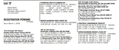Clinton County Classic 1800 Lindenthal Ave, Highland IL, 62249 Live lots - IVF Sessions - Embryos - Elite Choices Contact Agent: Catalog | Terms of Auction Download CATALOG Download ADDED LOTS Download SALE ORDER AND UPDATES Catalog | Terms Download CATALOG Download ADDED LOTS Download SALE ORDER AND UPDATES All Items (113) No Category (113) Categories All Items (113) No Category (113) Search Item #: Keyword: Search Catalog Item #: Keyword: 20 items per page 50 items per page 100 items per page Go to page #: 1 , 2 , 3 , 4 , 5 , 6 #4 – VANDOSKES ROGER THAT-ET 840 3309771260 99%RHA Brianne, Brooklyn & Reid Vandoske Born: Sept. 11, 2025 Location: 1800 Lindenthal Ave, Highland IL, 62249 More Info / Bid Now Track this Item Sold High Bid: $3,100.00 – #333 #4 – VANDOSKES ROGER THAT-ET Sold High Bid: $3,100 More Details More Info / Bid Track Item 840 3309771260 99%RHA Brianne, Brooklyn & Reid Vandoske Born: Sept. 11, 2025 Location: 1800 Lindenthal Ave, Highland IL, 62249 #5 – CURR-VALE MAJOR Registration pending 99%RHA-I John David Schilling Born: July 5, 2025 Location: 1800 Lindenthal Ave, Highland IL, 62249 More Info / Bid Now Track this Item Sold High Bid: $1,200.00 – #322 #5 – CURR-VALE MAJOR Sold High Bid: $1,200 More Details More Info / Bid Track Item Registration pending 99%RHA-I John David Schilling Born: July 5, 2025 Location: 1800 Lindenthal Ave, Highland IL, 62249 #6 – MILKSOURCE AUDACIOUS 840 3303097955 99%RHA-I Milk Source LLC Born: March 10, 2025 Location: 1800 Lindenthal Ave, Highland IL, 62249 More Info / Bid Now Track this Item Sold High Bid: $3,600.00 – #333 #6 – MILKSOURCE AUDACIOUS Sold High Bid: $3,600 More Details More Info / Bid Track Item 840 3303097955 99%RHA-I Milk Source LLC Born: March 10, 2025 Location: 1800 Lindenthal Ave, Highland IL, 62249 #7 – ENFUEGO HULU MAPLE SYRUP-ET 840 3324577337 RC 99%RHA-I Brett Woker Born: Dec. 3, 2025 Location: 1800 Lindenthal Ave, Highland IL, 62249 More Info / Bid Now Track this Item Sold High Bid: $3,100.00 – #322 #7 – ENFUEGO HULU MAPLE SYRUP-ET Sold High Bid: $3,100 More Details More Info / Bid Track Item 840 3324577337 RC 99%RHA-I Brett Woker Born: Dec. 3, 2025 Location: 1800 Lindenthal Ave, Highland IL, 62249 #8 – SCHLUTER ASPIRE-RED-ET 840 3234286950 99%RHA Olivia Schluter Born: June 2, 2021 c/o Jim Schluter EX-91-4Y EEEVE 2115 Ames Road 2-11 305 2X 21,807 3.7 798 3.2 708 Red Bud, Illinois 62278 2-00 298 2X 19,614 4.0 778 3.3 642 217-898-5707 Fresh Nov. 28, 2025 Nom. Jr. All-American Summer Jr. 2-Yr Old 2024 Location: 1800 Lindenthal Ave, Highland IL, 62249 More Info / Bid Now Track this Item Sold High Bid: $3,450.00 – #222 #8 – SCHLUTER ASPIRE-RED-ET Sold High Bid: $3,450 More Details More Info / Bid Track Item 840 3234286950 99%RHA Olivia Schluter Born: June 2, 2021 c/o Jim Schluter EX-91-4Y EEEVE 2115 Ames Road 2-11 305 2X 21,807 3.7 798 3.2 708 Red Bud, Illinois 62278 2-00 298 2X 19,614 4.0 778 3.3 642 217-898-5707 Fresh Nov. 28, 2025 Nom. Jr. All-American Summer Jr. 2-Yr Old 2024 Location: 1800 Lindenthal Ave, Highland IL, 62249 #9 – GOLDEN-OAKS KRYSTAL-RED-ET 840 3307227942 99%RHA-I Golden Oaks Farm Born: Sept. 1, 2025 Location: 1800 Lindenthal Ave, Highland IL, 62249 More Info / Bid Now Track this Item Sold High Bid: $3,300.00 – #333 #9 – GOLDEN-OAKS KRYSTAL-RED-ET Sold High Bid: $3,300 More Details More Info / Bid Track Item 840 3307227942 99%RHA-I Golden Oaks Farm Born: Sept. 1, 2025 Location: 1800 Lindenthal Ave, Highland IL, 62249 #10 – SARAH-FITZ CADILAC BELLA-ET 840 3287700721 A2/A2 99%RHA-I Sarah & Michael Fitzgerald Born: March 6, 2024 2913 Carlson Road Belvidere, Illinois 61008 815-298-2064 Due April 14, 2026 to Blondin Alpha-ET C 120345248 (ultrasound female) Location: 1800 Lindenthal Ave, Highland IL, 62249 More Info / Bid Now Track this Item Sold High Bid: $3,400.00 – #322 #10 – SARAH-FITZ CADILAC BELLA-ET Sold High Bid: $3,400 More Details More Info / Bid Track Item 840 3287700721 A2/A2 99%RHA-I Sarah & Michael Fitzgerald Born: March 6, 2024 2913 Carlson Road Belvidere, Illinois 61008 815-298-2064 Due April 14, 2026 to Blondin Alpha-ET C 120345248 (ultrasound female) Location: 1800 Lindenthal Ave, Highland IL, 62249 #11 – SARAH-FITZ DOC BIANCA-ET 840 3287700722 99%RHA-I Born: March 7, 2024 Due April 30, 2026 to Mr Budjon Superman-ET 8403269893847 (ultrasounD FEMALE Location: 1800 Lindenthal Ave, Highland IL, 62249 More Info / Bid Now Track this Item Sold High Bid: $4,350.00 – #222 #11 – SARAH-FITZ DOC BIANCA-ET Sold High Bid: $4,350 More Details More Info / Bid Track Item 840 3287700722 99%RHA-I Born: March 7, 2024 Due April 30, 2026 to Mr Budjon Superman-ET 8403269893847 (ultrasounD FEMALE Location: 1800 Lindenthal Ave, Highland IL, 62249 #12 – SILVERVIEW-LANE A ERICA-ET 840 3246968503 99%RHA-I Brett Woker Born: June 1, 2025 Location: 1800 Lindenthal Ave, Highland IL, 62249 More Info / Bid Now Track this Item Sold High Bid: $1,900.00 – #123 #12 – SILVERVIEW-LANE A ERICA-ET Sold High Bid: $1,900 More Details More Info / Bid Track Item 840 3246968503 99%RHA-I Brett Woker Born: June 1, 2025 Location: 1800 Lindenthal Ave, Highland IL, 62249 #13 – REDCARPET ALTITUDE REGISTRATION PENDING 99%RHA 34965 Kirkland Road Born: Dec. 4, 2025 Location: 1800 Lindenthal Ave, Highland IL, 62249 More Info / Bid Now Track this Item Sold High Bid: $3,600.00 – #222 #13 – REDCARPET ALTITUDE Sold High Bid: $3,600 More Details More Info / Bid Track Item REGISTRATION PENDING 99%RHA 34965 Kirkland Road Born: Dec. 4, 2025 Location: 1800 Lindenthal Ave, Highland IL, 62249 #14 – GOLDEN-OAKS CARTEL Registration Pending 99%RHA Born: Dec. 1, 2025 Location: 1800 Lindenthal Ave, Highland IL, 62249 More Info / Bid Now Track this Item Sold High Bid: $1,800.00 – #123 #14 – GOLDEN-OAKS CARTEL Sold High Bid: $1,800 More Details More Info / Bid Track Item Registration Pending 99%RHA Born: Dec. 1, 2025 Location: 1800 Lindenthal Ave, Highland IL, 62249 #15 – SCO-LO SK LAMBA-ET Registr