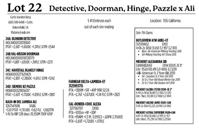 -Selling price is per Embryo or straw -Buyer is responsible for all costs of shipping expenses. This auction will utilize an auto-extend, soft closing closing. With this feature, the bidding will close on ALL lots at the same time (Race Horse Style) Bidding will start to close from 12 pm to 12:02 if any lots receive a bid after 12:01 they will extend bidding on all lots for an additional 2 minutes. Once 1 minute has lapsed without any bidding activity, then all lots will close.