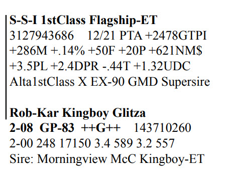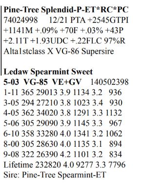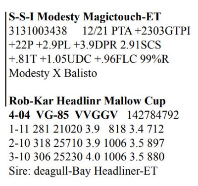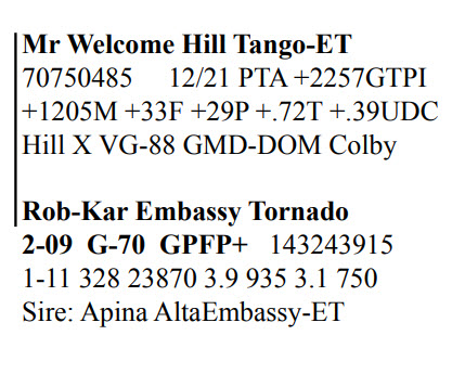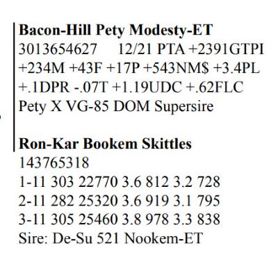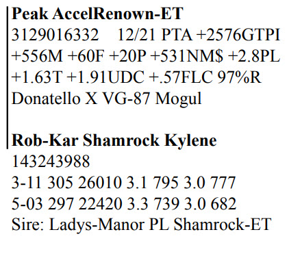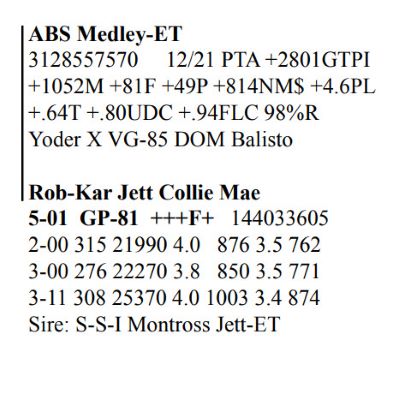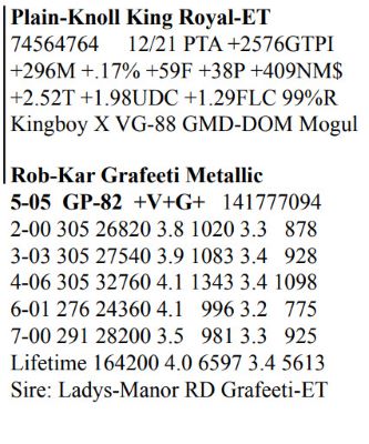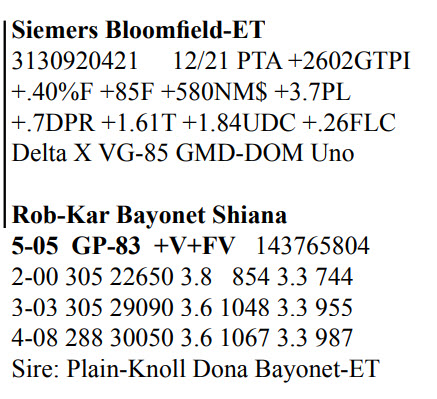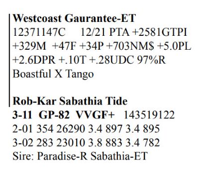 Rob-Kar Production Sale 10119 Five Forks Rd, Waynesboro PA, 17268 100 Freestall/parlor cows sell Contact Agent: Katie Shultz 717-543-7883 Catalog | Terms of Auction Download CATALOG Download SALE ORDER AND UPDATES Catalog | Terms Download CATALOG Download SALE ORDER AND UPDATES All Items (122) Cattle (122) Categories All Items (122) Cattle (122) Search Item #: Keyword: Search Catalog Item #: Keyword: 20 items per page 50 items per page 100 items per page Go to page #: 1 , 2 , 3 , 4 , 5 , 6 #15 – Rob-Kar Acelrnwn Kilometer 3-08 GP-81 GGGG+ 144273049 100%RHA-NA Born 5/25/17 2-04 253 17010 4.3 734 3.0 504 3-02 302 28527 3.8 1086 2.9 823 4-02 161 14353 3.7 532 2.8 400 RIP 1/3 test- 76 lbs 4.3%F 3.1%P SCC 35,000 Fresh 7/27/21 Bred 12/5/21, Due 9/11/22 to 250HO15397 Homecoming Location: 10119 Five Forks Rd, Waynesboro PA, 17268 Contact Agent: Katie Shultz 717-543-7883 More Info / Bid Now Track this Item Sold High Bid: $1,525.00 – #125 #15 – Rob-Kar Acelrnwn Kilometer Sold High Bid: $1,525 More Details More Info / Bid Track Item 3-08 GP-81 GGGG+ 144273049 100%RHA-NA Born 5/25/17 2-04 253 17010 4.3 734 3.0 504 3-02 302 28527 3.8 1086 2.9 823 4-02 161 14353 3.7 532 2.8 400 RIP 1/3 test- 76 lbs 4.3%F 3.1%P SCC 35,000 Fresh 7/27/21 Bred 12/5/21, Due 9/11/22 to 250HO15397 Homecoming Location: 10119 Five Forks Rd, Waynesboro PA, 17268 Contact Agent: Katie Shultz 717-543-7883 #23 – Rob-Kar Mayflower Morning 3-07 GP-81 ++FG+ 144273094 99%RHA-I Born 6/29/17 2-02 283 19124 4.0 757 3.1 598 3-01 298 30676 2.9 887 2.8 874 4-00 168 16455 3.0 494 3.0 494 RIP 1/3 test- 101 lbs 4.1%P 3.1%P SCC 71,000 Fresh 7/20/21 Bred 11/9/21, Due 8/16/22 to 250HOO15397 Homecoming Location: 10119 Five Forks Rd, Waynesboro PA, 17268 Contact Agent: Katie Shultz 717-543-7883 More Info / Bid Now Track this Item Sold High Bid: $1,700.00 – #101 #23 – Rob-Kar Mayflower Morning Sold High Bid: $1,700 More Details More Info / Bid Track Item 3-07 GP-81 ++FG+ 144273094 99%RHA-I Born 6/29/17 2-02 283 19124 4.0 757 3.1 598 3-01 298 30676 2.9 887 2.8 874 4-00 168 16455 3.0 494 3.0 494 RIP 1/3 test- 101 lbs 4.1%P 3.1%P SCC 71,000 Fresh 7/20/21 Bred 11/9/21, Due 8/16/22 to 250HOO15397 Homecoming Location: 10119 Five Forks Rd, Waynesboro PA, 17268 Contact Agent: Katie Shultz 717-543-7883 #29 – Grade Red & White Holstein Born 8/8/17 2-03 312 2,940 3.9 866 3.2 707 3-03 292 25653 2.4 622 3.1 803 4-02 69 5273 3.3 172 3.4 178 RIP 1/3 test- 93 lbs 2.8%F 3.2%P SCC 187,000 Fresh 10/27/21 Bred 12/28/21 to 7HO15085 Parfect Location: 10119 Five Forks Rd, Waynesboro PA, 17268 Contact Agent: Katie Shultz 717-543-7883 More Info / Bid Now Track this Item Sold High Bid: $1,625.00 – #130 #29 – Grade Red & White Holstein Sold High Bid: $1,625 More Details More Info / Bid Track Item Born 8/8/17 2-03 312 2,940 3.9 866 3.2 707 3-03 292 25653 2.4 622 3.1 803 4-02 69 5273 3.3 172 3.4 178 RIP 1/3 test- 93 lbs 2.8%F 3.2%P SCC 187,000 Fresh 10/27/21 Bred 12/28/21 to 7HO15085 Parfect Location: 10119 Five Forks Rd, Waynesboro PA, 17268 Contact Agent: Katie Shultz 717-543-7883 #46 – Rob-Kar Tango Tsunami 3-10 GP-81 +++F+ 144540387 99%RHA-NA Born 10/11/17 2-05 304 20888 4.4 918 3.2 670 3-05 282 25781 3.8 990 3.1 788 RIP 1/3 test- 57 lbs 4.4%F 3.6%P SCC 44,000 Fresh 3/28/21 Bred 8/20/21, Due 5/27/22 to 250HO15637 Level Location: 10119 Five Forks Rd, Waynesboro PA, 17268 Contact Agent: Katie Shultz 717-543-7883 More Info / Bid Now Track this Item Sold High Bid: $1,500.00 – #112 #46 – Rob-Kar Tango Tsunami Sold High Bid: $1,500 More Details More Info / Bid Track Item 3-10 GP-81 +++F+ 144540387 99%RHA-NA Born 10/11/17 2-05 304 20888 4.4 918 3.2 670 3-05 282 25781 3.8 990 3.1 788 RIP 1/3 test- 57 lbs 4.4%F 3.6%P SCC 44,000 Fresh 3/28/21 Bred 8/20/21, Due 5/27/22 to 250HO15637 Level Location: 10119 Five Forks Rd, Waynesboro PA, 17268 Contact Agent: Katie Shultz 717-543-7883 #48 – Rob-Kar Modesty Shor 3-10 GP-84 +EGG+ 144540396 99%RHA-I Born 10/16/17 2-03 365 36085 3.1 1130 2.8 1025 3-08 179 18716 3.1 572 2.9 535 RIP 1/3 test- 76 lbs 4.0%F 3.2%P SCC 27,000 Fresh 7/9/21 Bred 12/3/21, Due 9/9/22 to 250HO15397 Homecoming Location: 10119 Five Forks Rd, Waynesboro PA, 17268 Contact Agent: Katie Shultz 717-543-7883 More Info / Bid Now Track this Item Sold High Bid: $1,675.00 – #125 #48 – Rob-Kar Modesty Shor Sold High Bid: $1,675 More Details More Info / Bid Track Item 3-10 GP-84 +EGG+ 144540396 99%RHA-I Born 10/16/17 2-03 365 36085 3.1 1130 2.8 1025 3-08 179 18716 3.1 572 2.9 535 RIP 1/3 test- 76 lbs 4.0%F 3.2%P SCC 27,000 Fresh 7/9/21 Bred 12/3/21, Due 9/9/22 to 250HO15397 Homecoming Location: 10119 Five Forks Rd, Waynesboro PA, 17268 Contact Agent: Katie Shultz 717-543-7883 #52 – Rob-Kar Modesty Sharelle 3-09 GP-81 G+GG+ 144539932 99%RHA-I Born 11/29/17 2-05 365 27454 3.7 1002 3.1 843 3-07 164 15856 3.7 584 3.1 485 RIP 1/3 test- 78 lbs 4.7%F 3.4%P SCC 31,000 Fresh 7/24/21 Bred 11/21/21, Due 8/28/22 to 7HO15195 Lazer Location: 10119 Five Forks Rd, Waynesboro PA, 17268 Contact Agent: Katie Shultz 717-543-7883 More Info / Bid Now Track this Item Sold High Bid: $1,750.00 – #130 #52 – Rob-Kar Modesty Sharelle Sold High Bid: $1,750 More Details More Info / Bid Track Item 3-09 GP-81 G+GG+ 144539932 99%RHA-I Born 11/29/17 2-05 365 27454 3.7 1002 3.1 843 3-07 164 15856 3.7 584 3.1 485 RIP 1/3 test- 78 lbs 4.7%F 3.4%P SCC 31,000 Fresh 7/24/21 Bred 11/21/21, Due 8/28/22 to 7HO15195 Lazer Location: 10119 Five Forks Rd, Waynesboro PA, 17268 Contact Agent: Katie Shultz 717-543-7883 #53 – Grade Holstein Born 12/1/17 2-06 298 24731 4.4 1077 3.2 783 3-06 197 21523 4.5 963 3.1 657 RIP 1/3 test- 80 lbs 5.0%F 3.1%P SCC 20,000 Fresh 6/21/21 Bred 9/8/21, Due 6/15/22 to 14HO15367 Knockout Location: 10119 Five Forks Rd, Waynesboro PA, 17268 Contact Agent: Katie Shultz 717-543-7883 More Info / Bid Now Track this Item Sold High Bid: $1,600.00 – #1005 #53 – Grade Holstein Sold High Bid: $1,600 More Details More Info / Bid Track Item Born 12/1/17 2-06 298 24731 4.4 1077