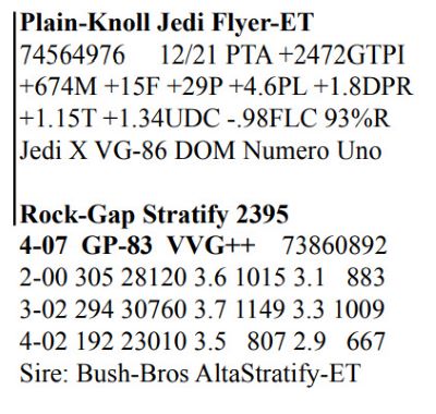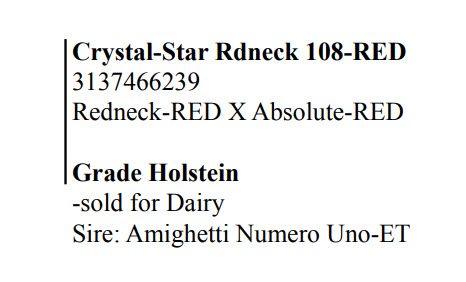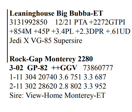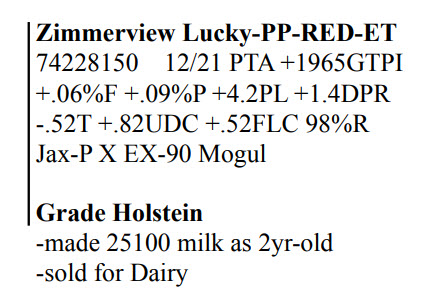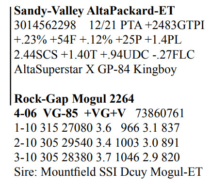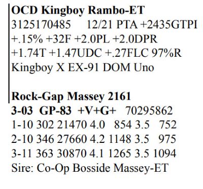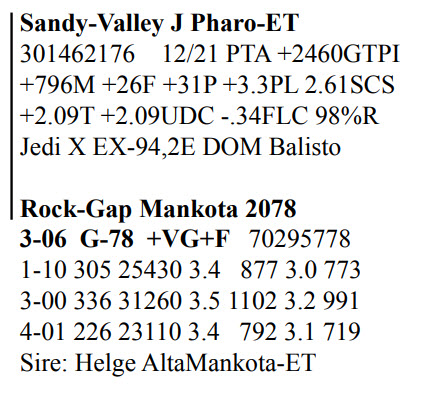 Rob-Kar Production Sale 10119 Five Forks Rd, Waynesboro PA, 17268 100 Freestall/parlor cows sell Contact Agent: Katie Shultz 717-543-7883 Catalog | Terms of Auction Download CATALOG Download SALE ORDER AND UPDATES Catalog | Terms Download CATALOG Download SALE ORDER AND UPDATES All Items (122) Cattle (122) Categories All Items (122) Cattle (122) Search Item #: Keyword: Search Catalog Item #: Keyword: 20 items per page 50 items per page 100 items per page Go to page #: 2 , 3 , 4 , 5 , 6 , 7 #1266 – Crystal-Star SB 1266-RED-ET 3201615568 99%RHA-I Born 9/19/18 Fresh 1/4/22 w/ 2nd calf *Potential 10th generation EX! Location: 10119 Five Forks Rd, Waynesboro PA, 17268 Contact Agent: Katie Shultz 717-543-7883 More Info / Bid Now Track this Item Sold High Bid: $2,050.00 – #104 #1266 – Crystal-Star SB 1266-RED-ET Sold High Bid: $2,050 More Details More Info / Bid Track Item 3201615568 99%RHA-I Born 9/19/18 Fresh 1/4/22 w/ 2nd calf *Potential 10th generation EX! Location: 10119 Five Forks Rd, Waynesboro PA, 17268 Contact Agent: Katie Shultz 717-543-7883 #1384 – *Sells as Grade Holstein Born 9/19/19 Fresh 12/15/21 Location: 10119 Five Forks Rd, Waynesboro PA, 17268 Contact Agent: Katie Shultz 717-543-7883 More Info / Bid Now Track this Item Sold High Bid: $1,775.00 – #114 #1384 – *Sells as Grade Holstein Sold High Bid: $1,775 More Details More Info / Bid Track Item Born 9/19/19 Fresh 12/15/21 Location: 10119 Five Forks Rd, Waynesboro PA, 17268 Contact Agent: Katie Shultz 717-543-7883 #1386 – *Sells as Grade Holstein Born 9/10/19 Fresh 12/25/21 Location: 10119 Five Forks Rd, Waynesboro PA, 17268 Contact Agent: Katie Shultz 717-543-7883 More Info / Bid Now Track this Item No Bids Starting at $900.00 Login to Bid #1386 – *Sells as Grade Holstein Starting at $900.00 Login to Bid More Details More Info / Bid Track Item Born 9/10/19 Fresh 12/25/21 Location: 10119 Five Forks Rd, Waynesboro PA, 17268 Contact Agent: Katie Shultz 717-543-7883 #1389 – *Sells as Grade Holstein Born 9/21/19 Fresh 12/22 test- 90 lbs 4.2%F 3.1%P SCC 76,000 Bred 1/11/22 to 200HO11028 Challenger *Buyer can register to 99%RHA-I Location: 10119 Five Forks Rd, Waynesboro PA, 17268 Contact Agent: Katie Shultz 717-543-7883 More Info / Bid Now Track this Item Sold High Bid: $1,800.00 – #112 #1389 – *Sells as Grade Holstein Sold High Bid: $1,800 More Details More Info / Bid Track Item Born 9/21/19 Fresh 12/22 test- 90 lbs 4.2%F 3.1%P SCC 76,000 Bred 1/11/22 to 200HO11028 Challenger *Buyer can register to 99%RHA-I Location: 10119 Five Forks Rd, Waynesboro PA, 17268 Contact Agent: Katie Shultz 717-543-7883 #1393 – *Sells as Grade Holstein Born 10/4/19 Fresh 11/3/21 12/22 test- 77 lbs 3.7%F 2.6%P SCC 35,000 Location: 10119 Five Forks Rd, Waynesboro PA, 17268 Contact Agent: Katie Shultz 717-543-7883 More Info / Bid Now Track this Item Sold High Bid: $1,800.00 – #114 #1393 – *Sells as Grade Holstein Sold High Bid: $1,800 More Details More Info / Bid Track Item Born 10/4/19 Fresh 11/3/21 12/22 test- 77 lbs 3.7%F 2.6%P SCC 35,000 Location: 10119 Five Forks Rd, Waynesboro PA, 17268 Contact Agent: Katie Shultz 717-543-7883 #1435 – Crystal-Star House 1435 3213137441 99%RHA-I Born 12/10/19 Fresh 11/20/21 12/22 test- 66 lbs 4.3%F 2.9%P SCC 13,000 Location: 10119 Five Forks Rd, Waynesboro PA, 17268 Contact Agent: Katie Shultz 717-543-7883 More Info / Bid Now Track this Item Sold High Bid: $1,675.00 – #114 #1435 – Crystal-Star House 1435 Sold High Bid: $1,675 More Details More Info / Bid Track Item 3213137441 99%RHA-I Born 12/10/19 Fresh 11/20/21 12/22 test- 66 lbs 4.3%F 2.9%P SCC 13,000 Location: 10119 Five Forks Rd, Waynesboro PA, 17268 Contact Agent: Katie Shultz 717-543-7883 #2474 – Rock-Gap Rambo 2474 3-04 GP-83 +++++ 73860971 99%RHA-I Born 9/21/17 1-10 304 22930 3.9 889 3.4 788 2-10 365 32910 3.9 1278 3.5 1147 Fresh 12/27/21 Location: 10119 Five Forks Rd, Waynesboro PA, 17268 Contact Agent: Katie Shultz 717-543-7883 More Info / Bid Now Track this Item Sold High Bid: $2,450.00 – #102 #2474 – Rock-Gap Rambo 2474 Sold High Bid: $2,450 More Details More Info / Bid Track Item 3-04 GP-83 +++++ 73860971 99%RHA-I Born 9/21/17 1-10 304 22930 3.9 889 3.4 788 2-10 365 32910 3.9 1278 3.5 1147 Fresh 12/27/21 Location: 10119 Five Forks Rd, Waynesboro PA, 17268 Contact Agent: Katie Shultz 717-543-7883 #2537 – Rock-Gap Pharo 2537 3-05 GP-83 +V+GV 3143486581 99%RHA-I Born 3/4/18 1-10 300 21921 3.5 766 3.1 669 2-09 306 27384 3.7 1015 2.9 802 Fresh 1/3/22 Location: 10119 Five Forks Rd, Waynesboro PA, 17268 Contact Agent: Katie Shultz 717-543-7883 More Info / Bid Now Track this Item Sold High Bid: $2,000.00 – #118 #2537 – Rock-Gap Pharo 2537 Sold High Bid: $2,000 More Details More Info / Bid Track Item 3-05 GP-83 +V+GV 3143486581 99%RHA-I Born 3/4/18 1-10 300 21921 3.5 766 3.1 669 2-09 306 27384 3.7 1015 2.9 802 Fresh 1/3/22 Location: 10119 Five Forks Rd, Waynesboro PA, 17268 Contact Agent: Katie Shultz 717-543-7883 #2627 – Rock-Gap Packard 2627 2-02 GP-80 G+G+G 3143486671 99%RHA-I Born 11/7/18 1-10 359 24050 4.5 1089 3.5 830 Fresh 11/23/21 12/20 test- 103 lbs 4.3%F 3.0%P Location: 10119 Five Forks Rd, Waynesboro PA, 17268 Contact Agent: Katie Shultz 717-543-7883 More Info / Bid Now Track this Item Sold High Bid: $2,025.00 – #130 #2627 – Rock-Gap Packard 2627 Sold High Bid: $2,025 More Details More Info / Bid Track Item 2-02 GP-80 G+G+G 3143486671 99%RHA-I Born 11/7/18 1-10 359 24050 4.5 1089 3.5 830 Fresh 11/23/21 12/20 test- 103 lbs 4.3%F 3.0%P Location: 10119 Five Forks Rd, Waynesboro PA, 17268 Contact Agent: Katie Shultz 717-543-7883 #2648 – Rock-Gap Bubba 2648 2-07 GP-81 G+GG+ 3143486692 99%RHA-I Born 1/14/19 1-10 306 25700 2.4 611 3.3 839 Fresh 11/27/21 12/20 test- 116 lbs 3.2% 2.7%P Location: 10119 Five Forks Rd, Waynesboro PA, 17268 Contact Agent: Katie Shultz 717-543-7883 More Info / Bid Now Track this Item Sold High Bid: $2,200.00 – #102 #2648 – Rock-Gap Bubba 2648 Sold High Bid: $2,200 More Detail