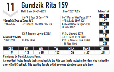 Birth Date: 04-01-2021 Cow *20319525 Tattoo: 159 An excellent footed female that stems back to the Rita cow family including her dam who is sired by