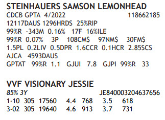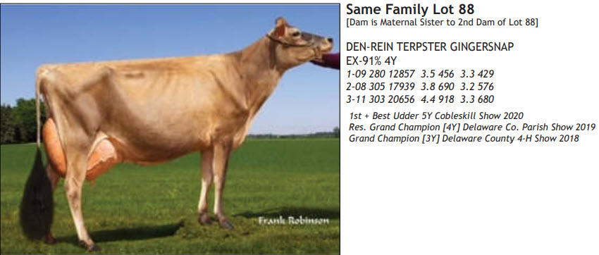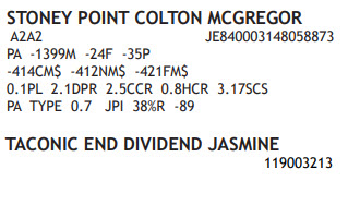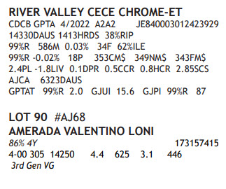 ALL BREED SUMMER PRODUCTION SALE 6096 NYS Route 8, New Berlin NY, 13411 Selling 130 Head Contact Agent: Katie Schultz 717-543-7883 Catalog | Terms of Auction Download CATALOG Download UPDATES Download ADDED LOTS Download SALE ORDER Catalog | Terms Download CATALOG Download UPDATES Download ADDED LOTS Download SALE ORDER All Items (183) Cattle (156) Embryos (3) Semen (24) Categories All Items (183) Cattle (156) Embryos (3) Semen (24) Search Item #: Keyword: Search Catalog Item #: Keyword: 20 items per page 50 items per page 100 items per page Go to page #: 3 , 4 , 5 , 6 , 7 , 8 #77 – MGR CHIEF PINK WHITNEY BORN 07/01/2021 SUMMER YEARLING GTPI +2144G Location: 6096 NYS Route 8, New Berlin NY, 13411 Contact Agent: Katie Schultz 717-543-7883 More Info / Bid Now Track this Item Sold High Bid: $900.00 – #112 #77 – MGR CHIEF PINK WHITNEY Sold High Bid: $900 More Details More Info / Bid Track Item BORN 07/01/2021 SUMMER YEARLING GTPI +2144G Location: 6096 NYS Route 8, New Berlin NY, 13411 Contact Agent: Katie Schultz 717-543-7883 #78 – JUNIPER CUNNING MISFIT BORN 07/30/2020 MILKING Fresh 7/25/22 PTPI +1868 Potential 10th Gen EX, VG Location: 6096 NYS Route 8, New Berlin NY, 13411 Contact Agent: Katie Schultz 717-543-7883 More Info / Bid Now Track this Item Sold High Bid: $2,000.00 – #9075 #78 – JUNIPER CUNNING MISFIT Sold High Bid: $2,000 More Details More Info / Bid Track Item BORN 07/30/2020 MILKING Fresh 7/25/22 PTPI +1868 Potential 10th Gen EX, VG Location: 6096 NYS Route 8, New Berlin NY, 13411 Contact Agent: Katie Schultz 717-543-7883 #79 – MGR DBACK WHISPER BORN 03/09/2020 MILKING Fresh 5/22/22 GP-81 +++++ 2Y Location: 6096 NYS Route 8, New Berlin NY, 13411 Contact Agent: Katie Schultz 717-543-7883 More Info / Bid Now Track this Item Sold High Bid: $1,750.00 – #357 #79 – MGR DBACK WHISPER Sold High Bid: $1,750 More Details More Info / Bid Track Item BORN 03/09/2020 MILKING Fresh 5/22/22 GP-81 +++++ 2Y Location: 6096 NYS Route 8, New Berlin NY, 13411 Contact Agent: Katie Schultz 717-543-7883 #80 – ROSELAND DING ME UP-RED BORN 09/02/2020 MILKING Fresh 6/20/22 GP-81 +++++ 2Y Location: 6096 NYS Route 8, New Berlin NY, 13411 Contact Agent: Katie Schultz 717-543-7883 More Info / Bid Now Track this Item Sold High Bid: $1,600.00 – #500 #80 – ROSELAND DING ME UP-RED Sold High Bid: $1,600 More Details More Info / Bid Track Item BORN 09/02/2020 MILKING Fresh 6/20/22 GP-81 +++++ 2Y Location: 6096 NYS Route 8, New Berlin NY, 13411 Contact Agent: Katie Schultz 717-543-7883 #81 – JUNIPER TATOO COLETTE BORN 06/26/2020 SELLS FRESH Fresh 7/27/22 GP-81 +++++ 2Y Potential 6th Gen EX, VG Location: 6096 NYS Route 8, New Berlin NY, 13411 Contact Agent: Katie Schultz 717-543-7883 More Info / Bid Now Track this Item Sold High Bid: $1,400.00 – #500 #81 – JUNIPER TATOO COLETTE Sold High Bid: $1,400 More Details More Info / Bid Track Item BORN 06/26/2020 SELLS FRESH Fresh 7/27/22 GP-81 +++++ 2Y Potential 6th Gen EX, VG Location: 6096 NYS Route 8, New Berlin NY, 13411 Contact Agent: Katie Schultz 717-543-7883 #81.5 – PENDING SUMMER YEARLING 2023 PENDING SUMMER YEARLING 2023 BORN 07/27/2022 SIRE CROTEAU LESPERRON UNIX 107567492 Location: 6096 NYS Route 8, New Berlin NY, 13411 Contact Agent: Katie Schultz 717-543-7883 More Info / Bid Now Track this Item No Bids Starting at $1,000.00 Login to Bid #81.5 – PENDING SUMMER YEARLING 2023 Starting at $1,000.00 Login to Bid More Details More Info / Bid Track Item PENDING SUMMER YEARLING 2023 BORN 07/27/2022 SIRE CROTEAU LESPERRON UNIX 107567492 Location: 6096 NYS Route 8, New Berlin NY, 13411 Contact Agent: Katie Schultz 717-543-7883 #82 – A JOY TEQUILA ELF BORN 12/18/2018 MILKING Fresh 6/6/22 Location: 6096 NYS Route 8, New Berlin NY, 13411 Contact Agent: Katie Schultz 717-543-7883 More Info / Bid Now Track this Item Sold High Bid: $1,650.00 – #1012 #82 – A JOY TEQUILA ELF Sold High Bid: $1,650 More Details More Info / Bid Track Item BORN 12/18/2018 MILKING Fresh 6/6/22 Location: 6096 NYS Route 8, New Berlin NY, 13411 Contact Agent: Katie Schultz 717-543-7883 #83 – POWDERSPRING TSL NATALEE BORN 04/20/2021 OPEN HEIFER Location: 6096 NYS Route 8, New Berlin NY, 13411 Contact Agent: Katie Schultz 717-543-7883 More Info / Bid Now Track this Item Sold High Bid: $675.00 – #3814 #83 – POWDERSPRING TSL NATALEE Sold High Bid: $675 More Details More Info / Bid Track Item BORN 04/20/2021 OPEN HEIFER Location: 6096 NYS Route 8, New Berlin NY, 13411 Contact Agent: Katie Schultz 717-543-7883 #84 – BAKER BROOK COLTON FLURRIE BORN 12/18/2019 SPRINGING [FIRST CALF] TO ANGUS BULL Location: 6096 NYS Route 8, New Berlin NY, 13411 Contact Agent: Katie Schultz 717-543-7883 More Info / Bid Now Track this Item Sold High Bid: $1,125.00 – #500 #84 – BAKER BROOK COLTON FLURRIE Sold High Bid: $1,125 More Details More Info / Bid Track Item BORN 12/18/2019 SPRINGING [FIRST CALF] TO ANGUS BULL Location: 6096 NYS Route 8, New Berlin NY, 13411 Contact Agent: Katie Schultz 717-543-7883 #85 – JX BAKER BROOK GINESS FRANNIE BORN 06/01/2019 DUE 9/22/22 TO ELLIOTS REGENCY CASINO-ET 3125141657 Location: 6096 NYS Route 8, New Berlin NY, 13411 Contact Agent: Katie Schultz 717-543-7883 More Info / Bid Now Track this Item Sold High Bid: $1,375.00 – #9035 #85 – JX BAKER BROOK GINESS FRANNIE Sold High Bid: $1,375 More Details More Info / Bid Track Item BORN 06/01/2019 DUE 9/22/22 TO ELLIOTS REGENCY CASINO-ET 3125141657 Location: 6096 NYS Route 8, New Berlin NY, 13411 Contact Agent: Katie Schultz 717-543-7883 #86 – TACONIC END MCGREGOR JENNA BORN 05/03/2021 OPEN HEIFER Location: 6096 NYS Route 8, New Berlin NY, 13411 Contact Agent: Katie Schultz 717-543-7883 More Info / Bid Now Track this Item Sold High Bid: $350.00 – #359 #86 – TACONIC END MCGREGOR JENNA Sold High Bid: $350 More Details More Info / Bid Track Item BORN 05/03/2021 OPEN HEIFER Location: 6096 NYS Route 8, New Berlin NY, 13411 Contact Agent: Katie Schultz 717-543-7883 #87 – RBJ VICTORIOUS GINGE