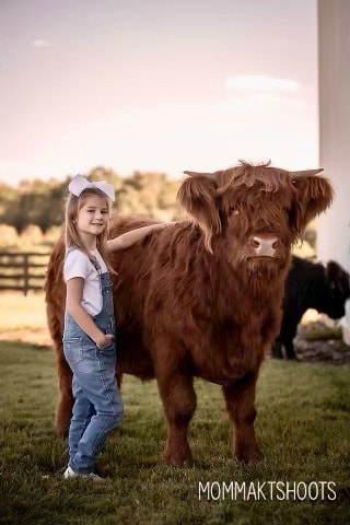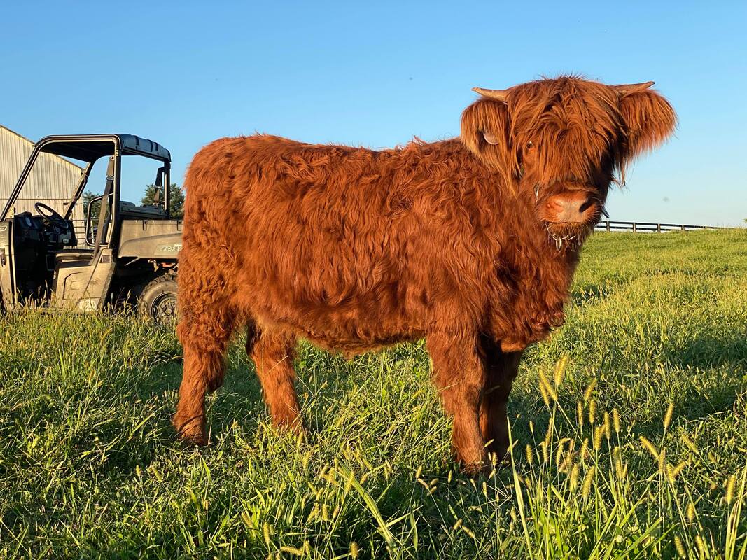 A great one through and through! Kenny is out of Hills N Holla Dolly (58879) and Sunset Rebel Yell (13784). Her dam, Dolly is one of our calmest cows. Kenny was shown in May at the Mid Atlantic Highland Cattle show and won Champion Senior Heifer Calf. Birth weight of 55 pounds. She has exhibited excellent gains from day one and at the 205 day weigh in reached 510 pounds at weaning. She is calm, cool and collected around all people, walks well on a lead and doesn't mind being tied or trailered. She has genetics in her pedigree including Sunset Limited Edition, Gusgurlach of Windrush, Landelly's Cody, Li Terra and more. Don't let this one get away from you, she is a fine one to add to anyone's collection.
