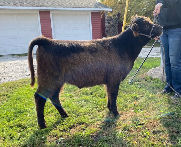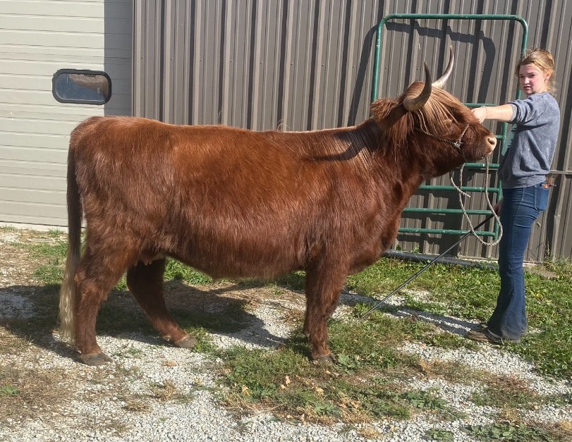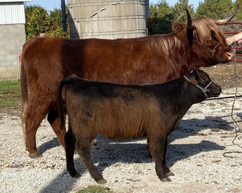 ?ADDITIONAL INFORMATION: We Tired Alyssa is a 4 year old, long bodied, medium framed cow with large feet that keep her on the go. She has excellent maternal instinct and has birthed 2 healthy calves. Aly has had unassisted births, with moderate birth weights and excellent rate of gain. She was AI exposed to Skye High Koal on September 10th. Her sire is BRF Barra, is known for having big bodied and framed offspring, as well as throwing the frosted color gene (red with white highlights). Alyssa's Dam is We Tired Juliette. Juliette is a large framed cow who has excellent maternal instinct, she exhibits longevity as she has birthed and raised 13 calves with excellent maternal instinct. Juliette has passed this highland characteristic on generation to generation. Alyssa’s steer calf, Beyond Hope Archer, (unregistered) is a dark dun steer calf born on June 26th with good feet and overall structure, he will be a great addition to your beef program. Archer's sire is Fieldstone MacNair, is known for giving his calves amazing rate of gain which he has passed on to Archer. Aly is a gentle cow, she has been an easy keeper and will add beauty and style to any fold.