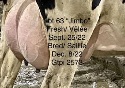USDA: 840003217449322 PERE: JIMBO Lactation #: 1 LAIT KG: 84 REPRO: SAILLIE GTPI: 2573 NEE: 12/08/20 PEDIGREE: NC Jimbo x VG Bandares x EX 93 Kingboy x VG 88 Iota x EX 92 Planet x 6 GEN VG or EX VELEE: 9/25/22