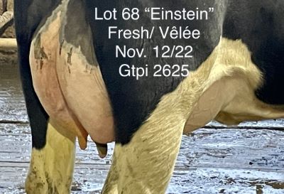 USDA: 840003217449376 PERE: EINSTEIN Lactation #: 1 LAIT KG: 95 REPRO: FRAICHE GTPI: 2625 NEE: 1/28/21 PEDIGREE: NC Einstein x EX 92 Silver x VG 87 x VG 88 MOM Halo x 7 gen VG or EX Same family as S-S-I Doc Have Not that sold for 1.9 MILLION VELEE: 11/12/22