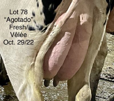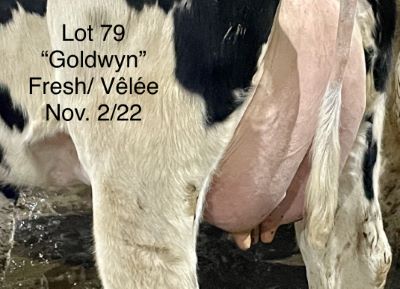 USDA: 840003221358834 PERE: GOLDWYN Lactation #: 1 LAIT KG: 83 REPRO: FRAICHE GTPI: 1696 NEE: 9/ 1/20 PEDIGREE: NC Goldwyn x EX 94 Luck-E Damion Tassel x EX 93 Approval x EX 91 Rudolph x EX 93 Astre x EX 3E Astro Jet VELEE: 11/02/22