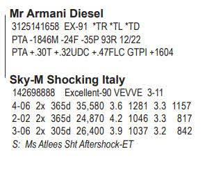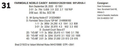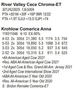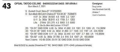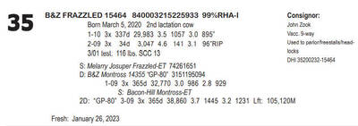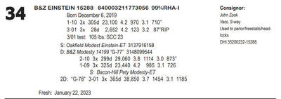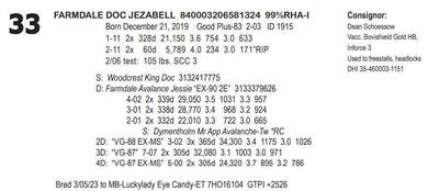 March Dairy Production Sale W4226 Hwy 23, Fond du Lac WI, 54937 Great offering of genetics... Contact Agent: Cady McGehee 863-697-0955 Catalog | Terms of Auction Download CATALOG Download SALE ORDER Catalog | Terms Download CATALOG Download SALE ORDER All Items (58) Cattle (58) Categories All Items (58) Cattle (58) Search Item #: Keyword: Search Catalog Item #: Keyword: 20 items per page 50 items per page 100 items per page Go to page #: 1 , 2 , 3 #21 – BRICCOWS AFTRSHOCK DUCE 840003200653757 Born July 1, 2019 Index No. 576 Very Good-85 2-05 2-00 2x 249d 19,760 3.5 689 2.9 564 2-10 2x 293d 21,243 3.2 670 3.0 633 RIP 2/24 test: 64.9 lbs. SCC 13 Bred 8/05/22 to Angus Location: W4226 Hwy 23, Fond du Lac WI, 54937 Contact Agent: Cady McGehee 863-697-0955 More Info / Bid Now Track this Item Sold High Bid: $1,850.00 – #500 #21 – BRICCOWS AFTRSHOCK DUCE Sold High Bid: $1,850 More Details More Info / Bid Track Item 840003200653757 Born July 1, 2019 Index No. 576 Very Good-85 2-05 2-00 2x 249d 19,760 3.5 689 2.9 564 2-10 2x 293d 21,243 3.2 670 3.0 633 RIP 2/24 test: 64.9 lbs. SCC 13 Bred 8/05/22 to Angus Location: W4226 Hwy 23, Fond du Lac WI, 54937 Contact Agent: Cady McGehee 863-697-0955 #22 – BRICCOWS DIESEL FRIUT SNACK 840003200653763 Born November 2, 2019 Index No. 582 Very Good-85 VG-MS 2-08 2-01 2x 311d 18,200 3.2 590 3.1 568 3-02 2x 44d 4,271 3.7 159 2.8 119 RIP 2/24 test: 105.1 lbs. SCC 29 Fresh: January 12, 2023 Location: W4226 Hwy 23, Fond du Lac WI, 54937 Contact Agent: Cady McGehee 863-697-0955 More Info / Bid Now Track this Item Sold High Bid: $2,250.00 – #1018 #22 – BRICCOWS DIESEL FRIUT SNACK Sold High Bid: $2,250 More Details More Info / Bid Track Item 840003200653763 Born November 2, 2019 Index No. 582 Very Good-85 VG-MS 2-08 2-01 2x 311d 18,200 3.2 590 3.1 568 3-02 2x 44d 4,271 3.7 159 2.8 119 RIP 2/24 test: 105.1 lbs. SCC 29 Fresh: January 12, 2023 Location: W4226 Hwy 23, Fond du Lac WI, 54937 Contact Agent: Cady McGehee 863-697-0955 #23 – SKY-M AFTERSHOCK IVONNE 840003220290790 Born February 11, 2021 Index No. 613 Entered in 2024 Shawano Co. Futurity Bred 8/10/22 to Sonnek GC Corvette-ET 7HO12042 Location: W4226 Hwy 23, Fond du Lac WI, 54937 Contact Agent: Cady McGehee 863-697-0955 More Info / Bid Now Track this Item Sold High Bid: $2,300.00 – #500 #23 – SKY-M AFTERSHOCK IVONNE Sold High Bid: $2,300 More Details More Info / Bid Track Item 840003220290790 Born February 11, 2021 Index No. 613 Entered in 2024 Shawano Co. Futurity Bred 8/10/22 to Sonnek GC Corvette-ET 7HO12042 Location: W4226 Hwy 23, Fond du Lac WI, 54937 Contact Agent: Cady McGehee 863-697-0955 #24 – SKY-M DEFIANT IDEE 840003200653746 Born February 19, 2019 Index No. 565 Very Good-86 VG-MS 2-10 2-04 2x 316d 22,890 4.1 941 3.3 757 3-04 2x 225d 17,604 4.3 763 3.3 581 RIP 2/24 test: 51.6 lbs. SCC 100 Bred 12/05/22 to Angus Location: W4226 Hwy 23, Fond du Lac WI, 54937 Contact Agent: Cady McGehee 863-697-0955 More Info / Bid Now Track this Item Sold High Bid: $2,250.00 – #500 #24 – SKY-M DEFIANT IDEE Sold High Bid: $2,250 More Details More Info / Bid Track Item 840003200653746 Born February 19, 2019 Index No. 565 Very Good-86 VG-MS 2-10 2-04 2x 316d 22,890 4.1 941 3.3 757 3-04 2x 225d 17,604 4.3 763 3.3 581 RIP 2/24 test: 51.6 lbs. SCC 100 Bred 12/05/22 to Angus Location: W4226 Hwy 23, Fond du Lac WI, 54937 Contact Agent: Cady McGehee 863-697-0955 #25 – SKY-M SANCHEZ ISRAEL 143562250 Born July 21, 2015 Index No. 475 35SVR1396 Excellent-93 EEEEE 2E 7-00 4-08 2x 365d 35,180 3.9 1387 3.0 1046 6-03 2x 345d 35,560 3.7 1308 2.9 1039 3-05 2x 365d 31,770 4.1 1305 3.3 1035 2-04 2x 349d 27,907 4.1 1158 3.1 876 7-03 2x 118d 12,583 4.2 534 3.1 390 RIP 2/24 test: 110.8 lbs. SCC 141 Bred 2/25/23 Location: W4226 Hwy 23, Fond du Lac WI, 54937 Contact Agent: Cady McGehee 863-697-0955 More Info / Bid Now Track this Item Sold High Bid: $2,000.00 – #1016 #25 – SKY-M SANCHEZ ISRAEL Sold High Bid: $2,000 More Details More Info / Bid Track Item 143562250 Born July 21, 2015 Index No. 475 35SVR1396 Excellent-93 EEEEE 2E 7-00 4-08 2x 365d 35,180 3.9 1387 3.0 1046 6-03 2x 345d 35,560 3.7 1308 2.9 1039 3-05 2x 365d 31,770 4.1 1305 3.3 1035 2-04 2x 349d 27,907 4.1 1158 3.1 876 7-03 2x 118d 12,583 4.2 534 3.1 390 RIP 2/24 test: 110.8 lbs. SCC 141 Bred 2/25/23 Location: W4226 Hwy 23, Fond du Lac WI, 54937 Contact Agent: Cady McGehee 863-697-0955 #26 – SKY-M DIESEL INPUT 840003200653759 Born September 1, 2019 Index No. 578 Good Plus-82 2-03 2-00 2x 365d 23,270 4.0 939 3.3 762 SCC: 117 Fresh: February 27, 2023 Location: W4226 Hwy 23, Fond du Lac WI, 54937 Contact Agent: Cady McGehee 863-697-0955 More Info / Bid Now Track this Item Sold High Bid: $1,750.00 – #500 #26 – SKY-M DIESEL INPUT Sold High Bid: $1,750 More Details More Info / Bid Track Item 840003200653759 Born September 1, 2019 Index No. 578 Good Plus-82 2-03 2-00 2x 365d 23,270 4.0 939 3.3 762 SCC: 117 Fresh: February 27, 2023 Location: W4226 Hwy 23, Fond du Lac WI, 54937 Contact Agent: Cady McGehee 863-697-0955 #27 – SKY-M AWESOME ID *RC 840003200653779 Born August 5, 2020 Index No. 598 2-00 2x 177d 11,827 4.1 480 2.9 344 RIP 2/24 test: 66.9 lbs. SCC 54 Bred 11/20/22 to Mr Blondin Warrior-Red-ET 7HO14477 Location: W4226 Hwy 23, Fond du Lac WI, 54937 Contact Agent: Cady McGehee 863-697-0955 More Info / Bid Now Track this Item Sold High Bid: $2,400.00 – #500 #27 – SKY-M AWESOME ID *RC Sold High Bid: $2,400 More Details More Info / Bid Track Item 840003200653779 Born August 5, 2020 Index No. 598 2-00 2x 177d 11,827 4.1 480 2.9 344 RIP 2/24 test: 66.9 lbs. SCC 54 Bred 11/20/22 to Mr Blondin Warrior-Red-ET 7HO14477 Location: W4226 Hwy 23, Fond du Lac WI, 54937 Contact Agent: Cady McGehee 863-697-0955 #28 – MILKSOURCE CHROME ANNANICOLE 840003205612568 Born June 29, 2020 Index No. 8048 Very Good-84% 2-01 1-11 2x 269d 14,598 4.8 702 3.2 473 RIP 2/24 test: 47.8 lbs. SCC 29 Bred 8/16/22 to Ratliff Money 117800702 Location: W4226 Hwy 23, Fond du Lac WI, 54