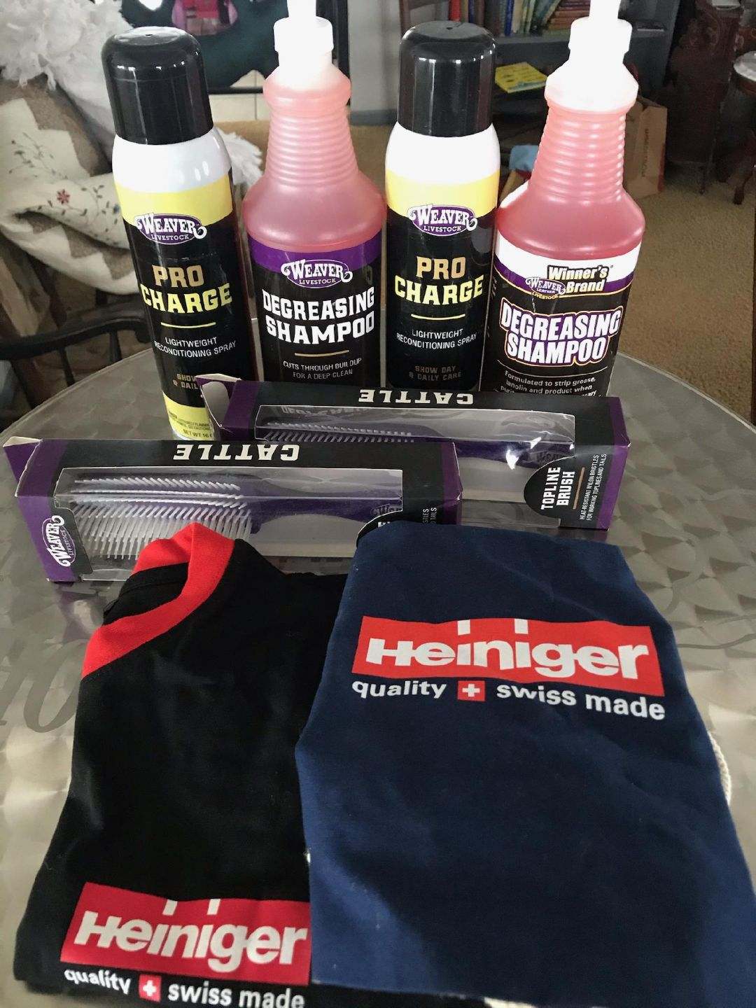 This package includes: 1 Bottle of Degreasing Shampoo, 1 bottle of Pro Charge, 1 - Topline Brush and a Heiniger Bag or T Shirt